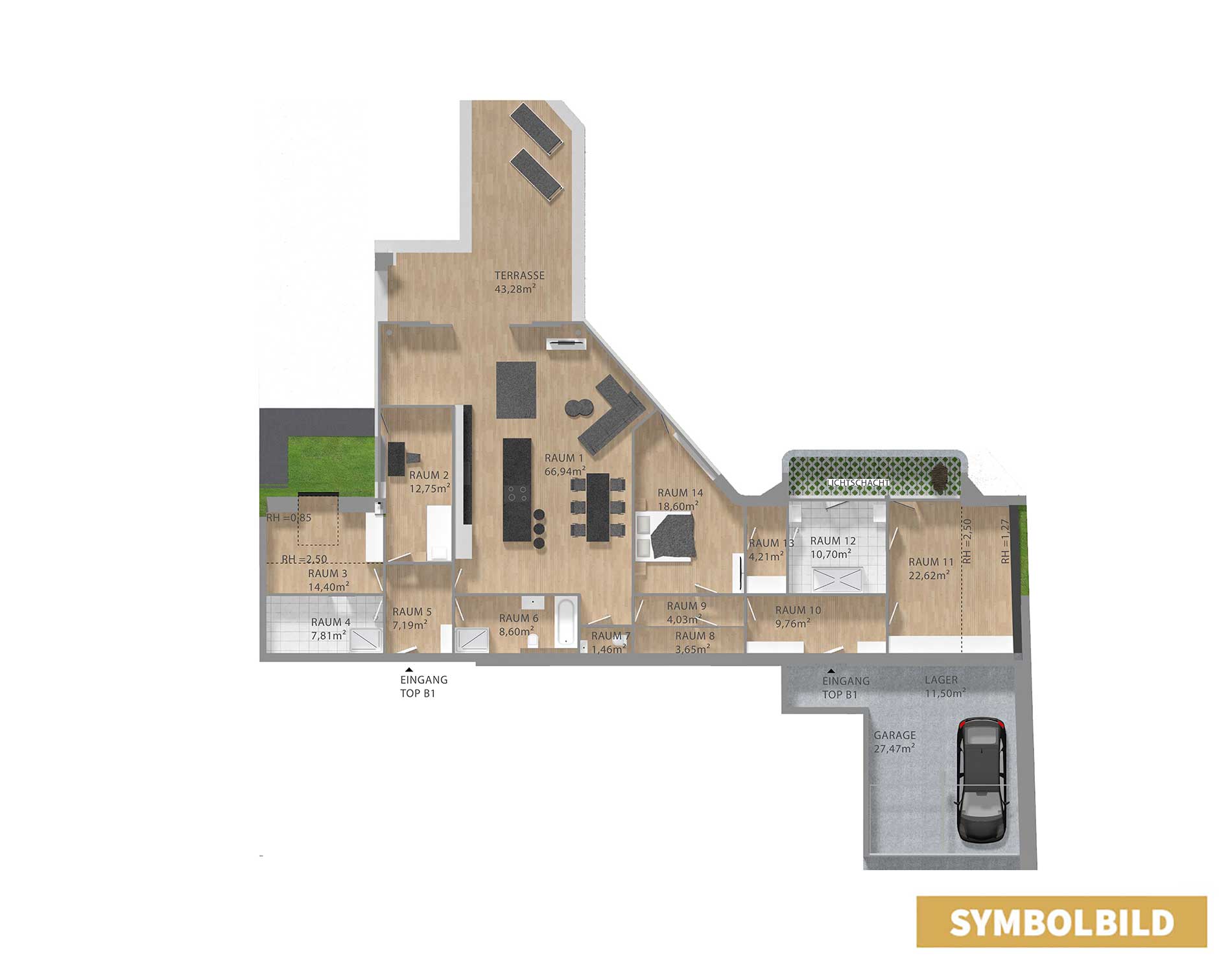 Funktionale Ausstattungen wie Fahrradraum und Doppelgaragen mit direktem Zugang zu den Wohnungen sowie hochmoderne Heizsysteme über Erdwärmepumpen garantieren Komfort und Langlebigkeit.